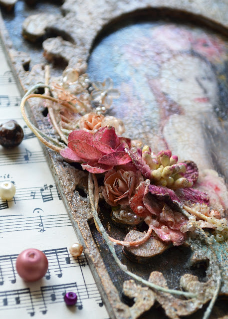 Добавила декор, припудрила его грунтом и нанесла еще спреи, объединяя таким образом все части в одно целое.